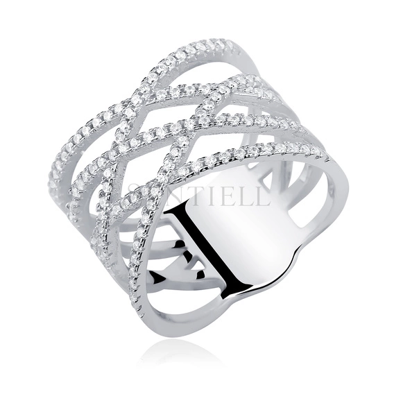 Srebrny, duży pierścionek skrzyżowany pr.925 cyrkonia biała