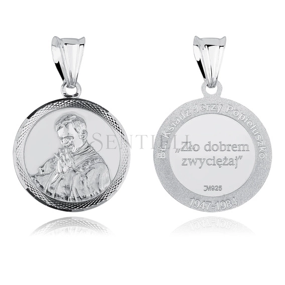 Dwustronny medalik wykonany ze srebra próby 925, o okrągłej formie i wymiarach 32 x 20 mm. Awers przedstawia wizerunek Błogosławionego księdza Jerzego Popiełuszki w ujęciu półprofilowym, z dłońmi złożonymi do modlitwy, opracowany w wyraźnym reliefie na gładkim tle, otoczonym diamentowaną ramką o regularnym wzorze. Rewers zawiera polskie inskrypcje, w tym cytat oraz imię i nazwisko, rozmieszczone na satynowanej powierzchni, z wyodrębnionym oznaczeniem próby oraz datami. Powierzchnia medalika łączy wysoki połysk z diamentowanym wykończeniem, krawędzie równe, profil lekko wypukły. Całość pokryta warstwą rodu.