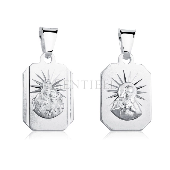 Dwustronny medalik typu szkaplerz wykonany ze srebra próby 925, o prostokątnej formie z ściętymi narożami i wymiarach 22 x 11 mm. Awers przedstawia wizerunek Matki Boskiej Szkaplerznej z Dzieciątkiem, wykonany w reliefie, umieszczony centralnie na tle promienistego, diamentowanego opracowania. Rewers zdobiony wizerunkiem Jezusa z Najświętszym Sercem, ujętym w reliefie na analogicznie opracowanym tle z promieniami. Powierzchnia medalika łączy wysoki połysk z diamentowanym wykończeniem, tworząc wyraźny kontrast między tłem a motywem. Krawędzie regularne, profil lekko wypukły. Całość pokryta warstwą rodu.
