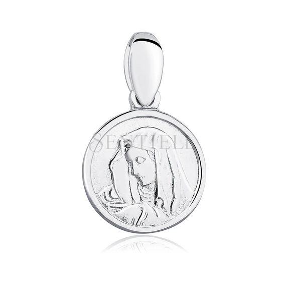 Medalik wykonany ze srebra próby 925, o okrągłej formie i wymiarach 19 x 12 mm. Na froncie przedstawiono wizerunek Matki Boskiej Madonna w ujęciu profilowym, z delikatnie zaznaczonymi rysami twarzy oraz miękko opracowanymi fałdami szat, wykonany w płytkim, czytelnym reliefie. Tło gładkie, otoczone wąską, regularną ramką podkreślającą kompozycję. Powierzchnia wykończona w wysokim połysku, krawędzie równe, profil lekko wypukły. Całość pokryta warstwą rodu.
