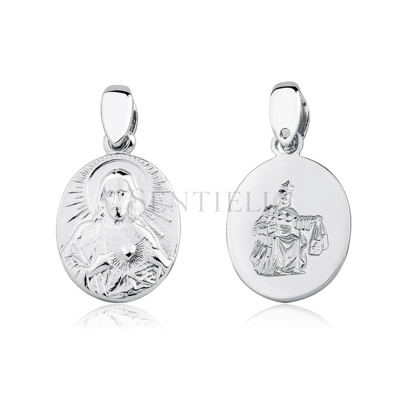 Dwustronny medalik wykonany ze srebra próby 925, o owalnym kształcie i wymiarach 22 x 12 mm. Na awersie znajduje się wizerunek Jezusa z Najświętszym Sercem, wykonany w wyraźnym reliefie na tle promienistej aureoli, z zaznaczonymi detalami twarzy oraz szat. Rewers przedstawia Matkę Boską Szkaplerzną z Dzieciątkiem, ujętą w płytkim reliefie na gładkiej, polerowanej powierzchni. Medalik posiada lekko wypukły profil oraz gładkie, regularnie wykończone krawędzie. Całość wykończona w wysokim połysku, z zastosowaną powłoką rodowaną.