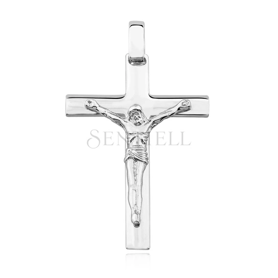 Zawieszka w formie krucyfiksu wykonana ze srebra próby 925, o wymiarach ok. 49 x 28 mm i przybliżonej wadze ok. 4 g. Ramiona krzyża mają prosty, równoległy profil z gładką powierzchnią wykończoną na wysoki połysk. Na froncie osadzona jest trójwymiarowa figura o wyraźnie modelowanych detalach, kontrastująca z płaskim tłem krzyża. Krawędzie boczne są delikatnie zaokrąglone, co podkreśla jednolity kontur elementu. Zawieszka wyposażona jest w prostą, zamkniętą krawatkę o owalnym profilu, dopasowaną do wielkości krzyżyka. Całość wykończona jest rodowaniem.