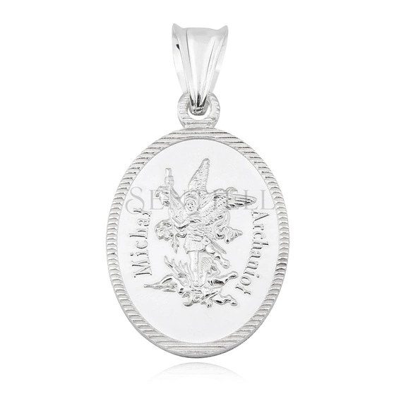 Medalik wykonany ze srebra próby 925, o wymiarach 34 x 17 mm, w formie owalnej z wyraźnie zaznaczonym obrzeżem. Awers przedstawia wizerunek Michała Archanioła w dynamicznym reliefie, z mieczem i skrzydłami, osadzonego na gładkim tle. Wzdłuż krawędzi widoczne są polskie napisy, integralnie wkomponowane w kompozycję. Obrzeże medalika zdobione jest regularnym diamentowaniem, które kontrastuje z gładką powierzchnią centralną i podkreśla kontur zawieszki. Powierzchnia wykończona w wysokim połysku, całość pokryta warstwą rodu nadającą jednolity srebrzysty odcień. Zawieszka posiada standardową krawatkę.