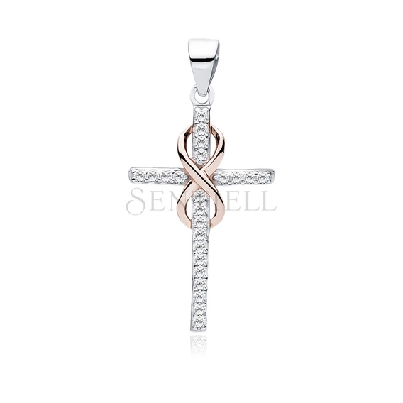 Srebrny pr. 925 krzyżyk rodowany z pozłacanym różowym złotem motywem nieskończoności i cyrkoniami 33 x 16 mm