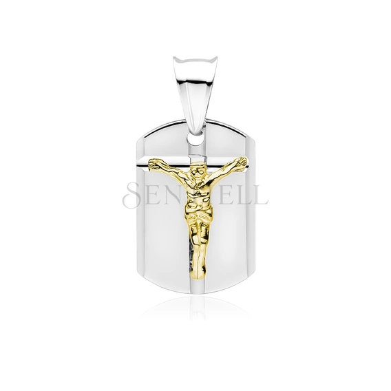 Medalik w formie zawieszki wykonany ze srebra próby 925, o prostokątnym kształcie z zaokrąglonymi narożnikami i gładkim, płaskim profilu. Front przedstawia krzyż z centralnie umieszczonym wizerunkiem Jezusa, wykonanym w wyraźnym, wypukłym reliefie i selektywnie pozłacanym. Tło medalika jest gładkie, polerowane, z subtelnym podziałem płaszczyzn podkreślającym pion i poziom ramion krzyża. Kontrast pomiędzy rodowaną powierzchnią srebra a złoconym reliefem postaci nadaje kompozycji czytelność i wyraźną strukturę. Całość wykończona w wysokim połysku, z powierzchnią zabezpieczoną warstwą rodu, natomiast wizerunek Jezusa pokryty warstwą 24K żółtego złota. Medalik ma proporcje 25 mm długości i 12 mm szerokości, wyposażony w standardową krawatkę.
