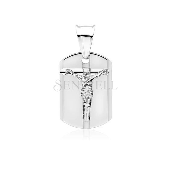 Medalik w formie zawieszki wykonany ze srebra próby 925, o wydłużonym kształcie z zaokrąglonym dołem i łagodnie wyprofilowaną górną krawędzią. Front przedstawia krzyż z centralnie umieszczonym wizerunkiem Jezusa, wykonanym w wyraźnym, wypukłym reliefie. Tło medalika jest gładkie i polerowane, z delikatnym podziałem płaszczyzn akcentującym pion krzyża. Elementy krzyża opracowane w technice diamentowania, co nadaje powierzchni subtelną strukturę i kontrast względem wysokiego połysku pozostałych pól. Całość pokryta warstwą rodu, stabilizującą barwę srebra i ograniczającą utlenianie. Medalik ma proporcje 25 mm długości i 12 mm szerokości, wyposażony w standardową krawatkę.