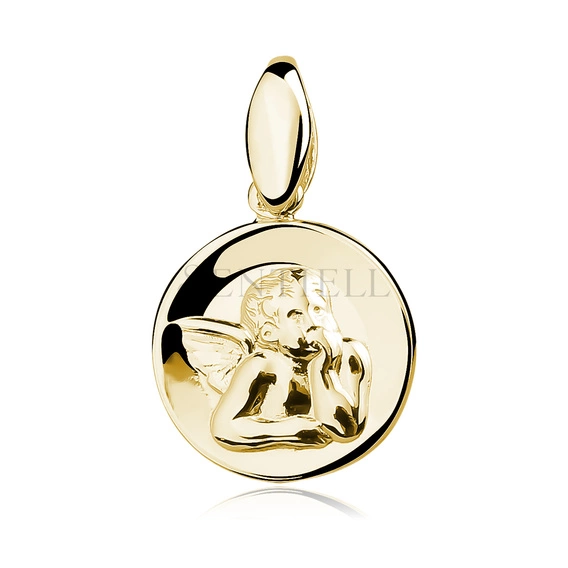 Medalik w formie zawieszki wykonany ze srebra próby 925, o okrągłym kształcie i gładkim, lekko zaokrąglonym profilu krawędzi. Front zdobi wypukły wizerunek Aniołka w klasycznym ujęciu, osadzony centralnie na jednolitej, lustrzanej powierzchni tła. Całość wykończona w wysokim połysku, z wyraźnym kontrastem pomiędzy reliefem a płaską płaszczyzną medalika. Powierzchnia srebra pokryta warstwą 24K żółtego złota w technologii e-coating, zapewniającą jednolitą barwę i gładkie wykończenie. Medalik ma proporcje 23 mm długości i 14 mm szerokości, wyposażony w standardową krawatkę umożliwiającą montaż na łańcuszku.