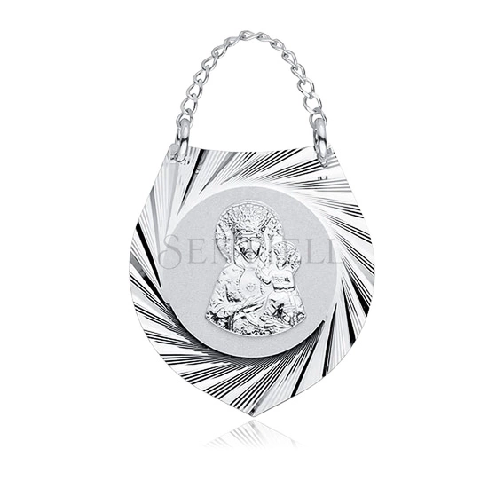 Medalik typu ryngraf wykonany ze srebra próby 925, z powierzchnią rodowaną. Forma tarczowa o wymiarach około 27 x 30 mm, z zawieszeniem w górnej części. Centralnie umieszczony okrągły medalion z reliefowym wizerunkiem Matki Boskiej z Dzieciątkiem, osadzony na satynowanym tle. Tło ryngrafu zdobione promienistym, diamentowanym rysunkiem, tworzącym wyraźny kontrast z gładkimi i matowanymi płaszczyznami. Krawędzie równe, profil płaski, kompozycja symetryczna i charakterystyczna dla formy ryngrafu.