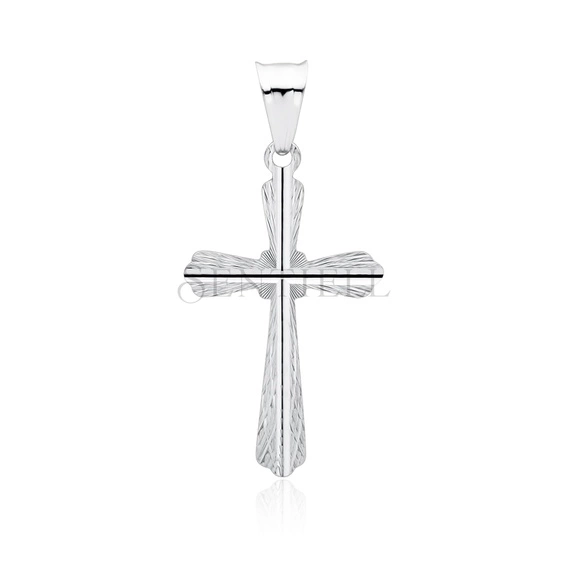 Zawieszka w formie krzyżyka wykonana ze srebra pr. 925, pokryta warstwą rodu. Ramiona mają poszerzony, profilowany kształt z diamentowanym wykończeniem tworzącym wyraźną, geometryczną strukturę powierzchni. Centralną oś podkreśla gładki, pionowy pas przechodzący przez przecięcie ramion.