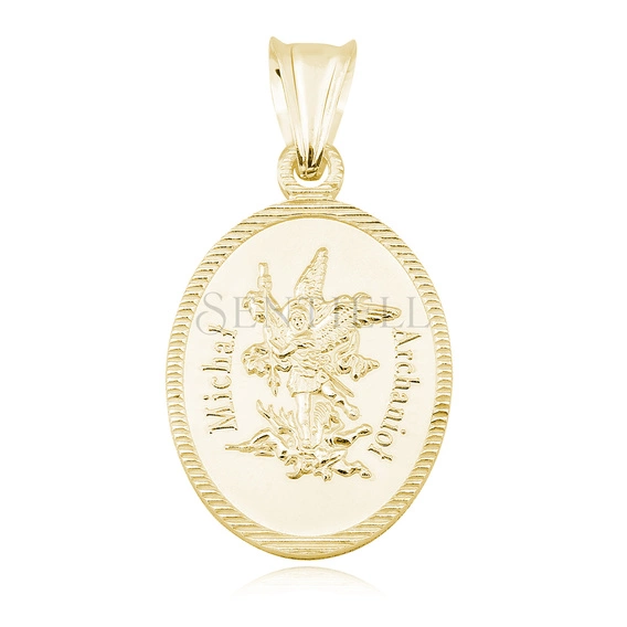 Medalik w formie zawieszki wykonany ze srebra próby 925, pokryty powłoką z żółtego złota 24K w technologii e-coating. Owalny kształt o wymiarach 35 x 18 mm, z wyraźnie zaznaczoną, diamentowaną obwódką biegnącą wzdłuż krawędzi. Awers zdobiony reliefowym wizerunkiem Michała Archanioła w dynamicznej kompozycji, osadzonym na gładkim tle o wysokim połysku. Rewers ma jednolitą powierzchnię z polskim napisem wykonanym w formie czytelnej inskrypcji. Profil płaski, krawędzie równe, konstrukcja typowa dla medalika dewocyjnego.