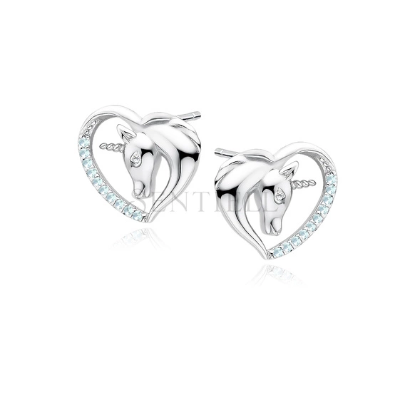 Srebrne kolczyki pr. 925 serce - jednorożec z akwamarynowymi cyrkoniami i białym okiem