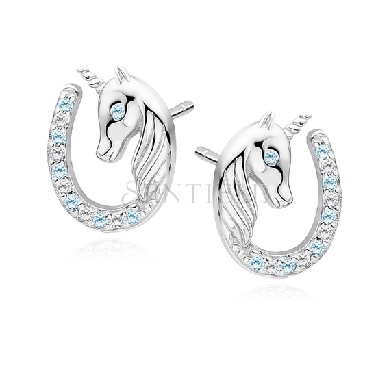 Srebrne kolczyki pr. 925 podkowa - jednorożec z białymi i akwamarynowymi cyrkoniami oraz akwamarynowym okiem