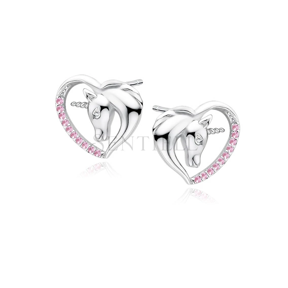 Srebrne kolczyki pr. 925 serce - jednorożec z różowymi cyrkoniami i białym okiem