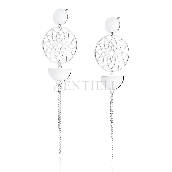 Srebrne (925) kolczyki - Mandala z kółkiem, półkolem i łańcuszkami