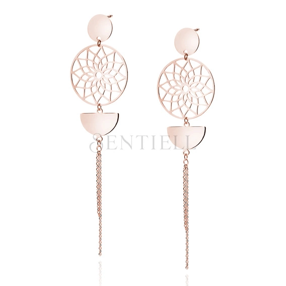 Srebrne (925) pozłacane kolczyki - Mandala z kółkiem, półkolem i łańcuszkami - różowe złoto