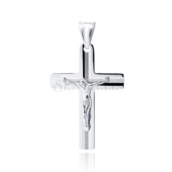 Zawieszka w formie krzyżyka wykonana ze srebra pr. 925, o wymiarach 45 x 26 mm. Ramiona mają gładką, wypolerowaną powierzchnię, a na pionowej i poziomej osi widoczne są diamentowane paski w postaci cienkich, równoległych linii. W centralnej części umieszczono przestrzenną figurę.