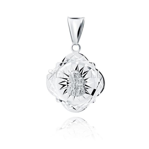 Medalik wykonany ze srebra próby 925, pokryty warstwą rodu. Forma rozbudowana, o dekoracyjnym, wielopłaszczyznowym obrysie z wyraźnie profilowaną, diamentowaną krawędzią. Centralnie umieszczony wizerunek Matki Boskiej Częstochowskiej wykonany w wypukłym reliefie, osadzony na tle z promienistym motywem uzyskanym techniką diamentowania. Powierzchnia o zróżnicowanej fakturze, z wyraźnym kontrastem pomiędzy reliefem a diamentowanymi nacięciami. Proporcje medalika wynoszą około 31 mm długości i 20 mm szerokości.