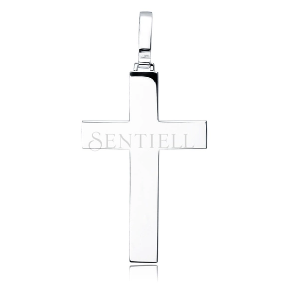 Zawieszka w formie krzyża wykonana ze srebra pr. 925, o wymiarach 82 x 42 mm. Ramiona mają prosty, równoległy profil i są w całości wykończone w wysokim połysku, bez dodatkowej faktury na froncie. Krawędzie pozostają gładkie, z wyraźnym, jednolitym obrysem.