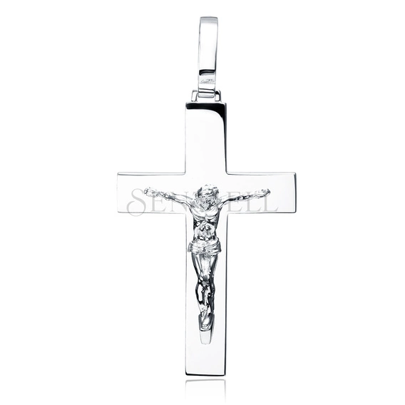 Zawieszka w formie krzyża wykonana ze srebra pr. 925, o dużych wymiarach 82 x 42 mm. Powierzchnia ramion jest gładka i utrzymana w wysokim połysku, z prostym, równoległym profilem oraz wyraźnie zarysowanymi krawędziami. Centralnie osadzona jest przestrzenna figura o pełnym modelunku.