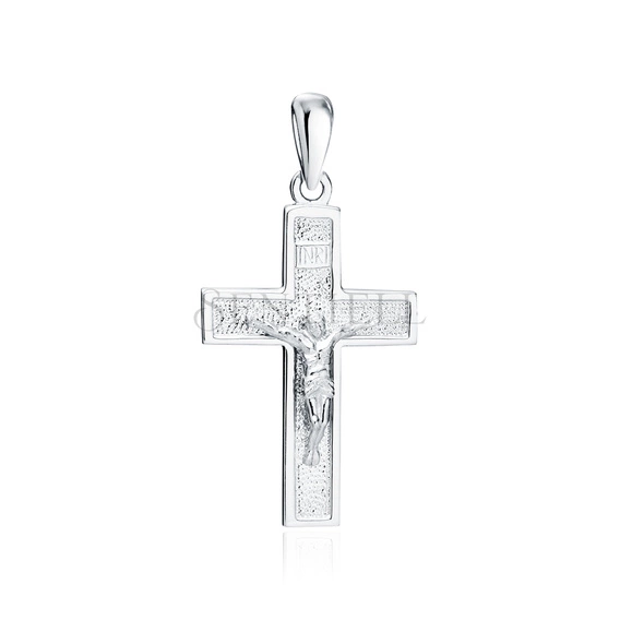 Zawieszka w formie krzyża wykonana ze srebra pr. 925, o wymiarach 38 x 19 mm. Front wypełnia diamentowana powierzchnia o drobnej, ziarnistej strukturze, wyraźnie oddzielona gładkim rantem biegnącym wokół obrysu. W centralnej części znajduje się przestrzenna figura oraz tabliczka INRI w górnym segmencie.
