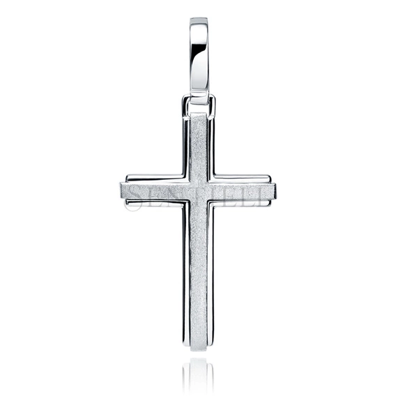 Zawieszka w formie krzyżyka wykonana ze srebra pr. 925, o wymiarach 49 x 24 mm. Front ma satynowaną powierzchnię z wyraźnym, gładkim rantem biegnącym wzdłuż całego obrysu, pozostawionym w wysokim połysku. Ramiona mają prosty, równoległy profil z lekko zaakcentowaną krawędzią.
