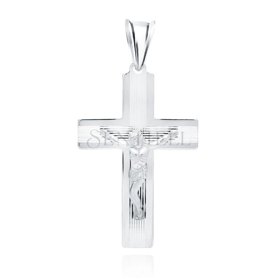 Zawieszka w formie krzyżyka wykonana ze srebra pr. 925, o wymiarach 52 x 26 mm, z centralnie umieszczoną przestrzenną figurą. Ramiona mają prostokątny profil z pionowymi i poziomymi nacięciami uzyskanymi poprzez diamentowanie, co tworzy wyraźny, liniowy podział powierzchni. Krawędzie pozostawiono w wysokim połysku, a całość pokryto warstwą rodu.