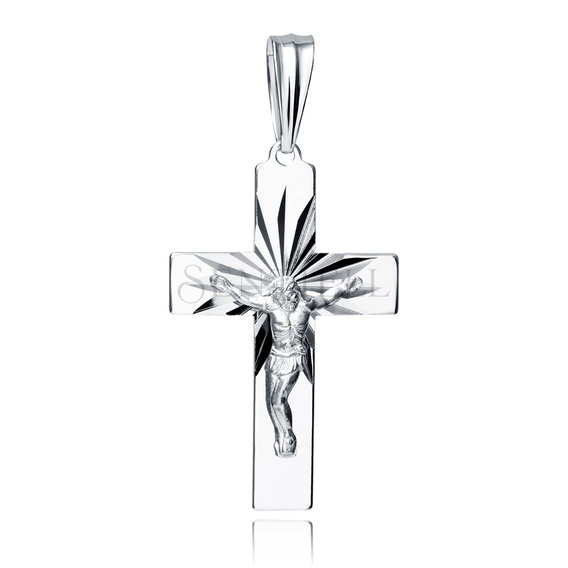 Okazały krzyżyk wykonany ze srebra próby 925 i pokryty rodem ma wymiary 52 × 26 mm oraz wagę ok. 4,7 g. Front zdobi efektowne, promieniste diamentowanie, które rozchodzi się spod centralnego punktu i podkreśla trójwymiarową sylwetkę Chrystusa umieszczoną na tle gładkich, polerowanych ramion. Krawędzie są proste, lekko zaokrąglone, a masywniejsza konstrukcja nadaje zawieszce wyrazistości.
