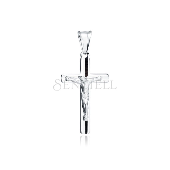 Zawieszka w formie dużego krzyżyka wykonana ze srebra próby 925 i pokryta powłoką rodu ma wymiary 45 x 21 mm oraz wagę ok. 2,4 g. Ramiona posiadają gładki, polerowany front z subtelnym liniowym diamentowaniem biegnącym wzdłuż osi krzyżyka. Centralnie umieszczona jest reliefowa sylwetka Chrystusa osadzona na jednolitym tle. Profil krzyża jest prosty i symetryczny, z lekko zaokrąglonymi krawędziami. Górna zawieszka o zwężającym się kształcie umożliwia montaż na mocniejszych łańcuszkach jubilerskich.