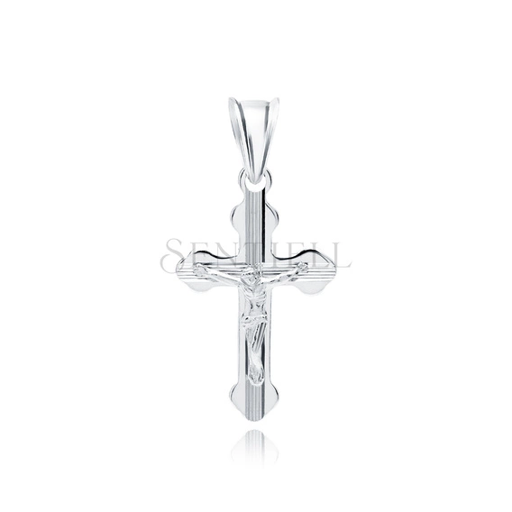 Zawieszka w formie krzyżyka wykonana ze srebra próby 925 i pokryta powłoką rodu ma wymiary 26 x 12 mm oraz wagę ok. 0,9 g. Ramiona mają polerowany front z liniowym diamentowaniem prowadzonym wzdłuż osi, a ich zakończenia ukształtowane są w lekko rozszerzone, zaokrąglone formy. Centralnie umieszczona jest reliefowa sylwetka Chrystusa na gładkim tle. Krawędzie krzyżyka są delikatnie zaokrąglone, a górna zawieszka o zwężającym się profilu umożliwia montaż na cienkich łańcuszkach jubilerskich.