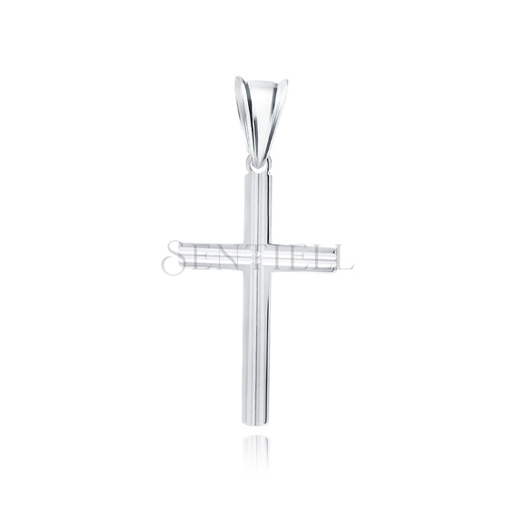 Zawieszka w formie wydłużonego krzyżyka wykonana ze srebra próby 925 i pokryta powłoką rodu ma wymiary 35 x 16 mm oraz wagę ok. 1,1 g. Ramiona posiadają polerowany front z liniowym diamentowaniem prowadzonym wzdłuż ich osi, co podkreśla symetryczny, prosty profil. Krawędzie są gładkie i lekko zaokrąglone, a górna zawieszka o zwężającym się kształcie umożliwia montaż na standardowych łańcuszkach jubilerskich.