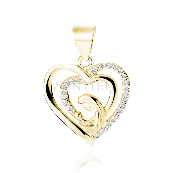 Srebrna pozłacana zawieszka pr.925 matka z dzieckiem w sercu z białymi cyrkoniami