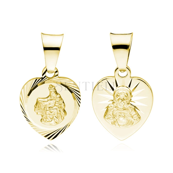 Dwustronny medalik w kształcie serca wykonany ze srebra próby 925, pokryty warstwą 24K żółtego złota z powłoką e-coating. Na jednej stronie wizerunek Matki Boskiej Szkaplerznej w wypukłym reliefie, osadzony w gładkim polu centralnym z diamentowanym, skrętnym motywem biegnącym wzdłuż krawędzi. Na drugiej stronie wizerunek Jezusa otoczony promienistym motywem wykonanym techniką diamentowania z elementami satynowania. Powierzchnia w wysokim połysku, z wyraźnym zróżnicowaniem faktur pomiędzy partiami gładkimi, diamentowanymi i satynowanymi. Wymiary medalika wynoszą około 19 mm długości i 10 mm szerokości.