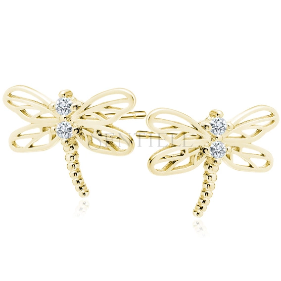 Srebrne pozłacane kolczyki pr. 925 - ważka z białymi cyrkoniami
