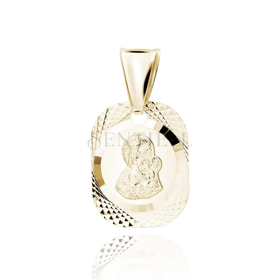 Medalik w formie zawieszki wykonany ze srebra próby 925, pokryty warstwą 24K żółtego złota w technologii e-coating. Korpus o proporcjach 10 x 18 mm, z centralnym, gładkim polem w kształcie owalu, na którym umieszczono wizerunek Matki Boskiej Częstochowskiej wykonany w płytkim reliefie. Obrzeże szerokie, z wyraźnym diamentowanym nacięciem o regularnej, geometrycznej strukturze, tworzącym kontrast z polerowanym polem centralnym. Powierzchnia medalika jednolicie wykończona techniką diamentowania, z czytelnym połyskiem.