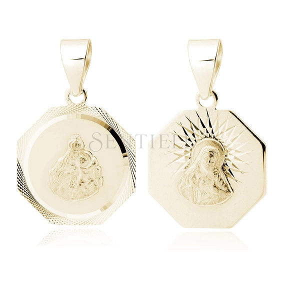 Dwustronny medalik wykonany ze srebra pr. 925, pokryty powłoką złota 24K w technologii e-coating. Ośmiokątna forma o wymiarach 14 x 23 mm łączy polerowany profil z diamentowaną ramką. Strona z wizerunkiem Jezusa posiada promieniste tło utworzone precyzyjnymi żłobieniami, natomiast strona z Matką Boską Szkaplerzną ma jednolite, gładkie tło z centralnie osadzonym reliefem. Krawatka w standardowym rozmiarze umożliwia montaż na typowych łańcuszkach jubilerskich. Waga medalika wynosi około 1,7 g.