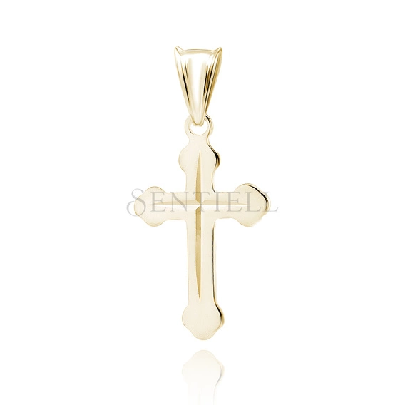 Zawieszka w formie krzyżyka wykonana ze srebra pr. 925 i pokryta warstwą 24-karatowego złota metodą e-coating. Model ma klasyczną sylwetkę o długości 26 mm i szerokości 12 mm, wykończoną na wysoki połysk. Charakterystyczne, zaokrąglone zakończenia ramion nadają mu miękki, dekoracyjny kształt. Na froncie krzyża znajduje się subtelny, diamentowany grawer w formie symetrycznego krzyża wpisanego w jego powierzchnię — delikatne żłobienia biegną pionowo i poziomo, spotykając się w centralnym punkcie i tworząc efekt precyzyjnego światłocienia. Zawieszka wyposażona jest w elegancką, zamkniętą krawatkę odpowiednią do większości łańcuszków.