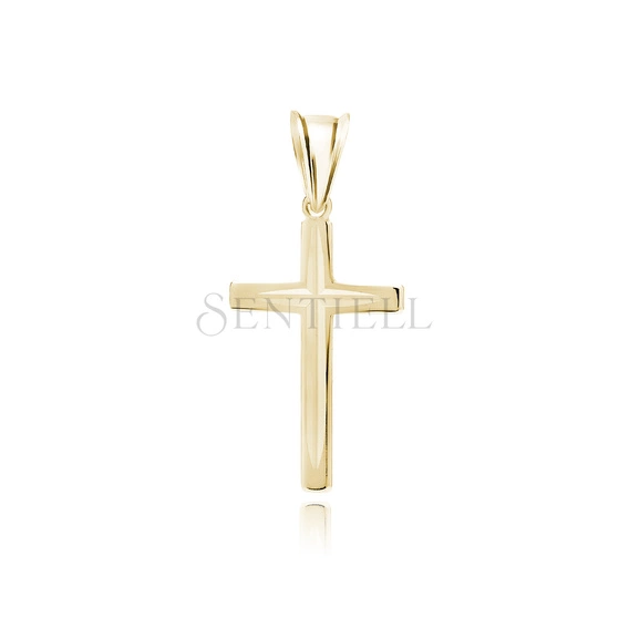 Zawieszka w formie krzyżyka wykonana ze srebra pr. 925 z powłoką 24-karatowego złota. Model o wymiarach 29 mm × 13 mm ma smukłą, prostą formę z delikatnie zaokrąglonymi krawędziami. Centralną część zdobi subtelny, diamentowany ornament w kształcie krzyża wpisany w jego powierzchnię, który dodaje całości eleganckiego blasku i podkreśla symetrię projektu. Powierzchnia jest gładka, polerowana na wysoki połysk. Zawieszka posiada klasyczną, zamkniętą krawatkę przystosowaną do standardowych łańcuszków.