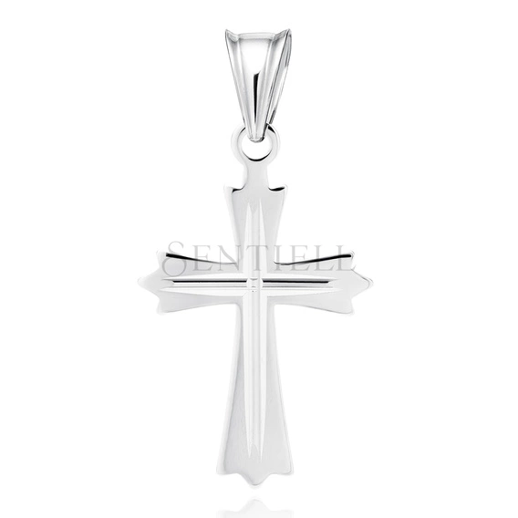 Zawieszka w formie krzyżyka wykonana ze srebra pr. 925 z powłoką rodu. Model o wymiarach 33 mm × 17 mm wyróżnia się dekoracyjnym wykończeniem ramion, których krawędzie mają lekko geometryczne, rozchylone zakończenia. Na powierzchni ramion oraz pionowego trzonu widoczne są precyzyjne, diamentowane żłobienia podkreślające symetrię kompozycji. Centralne skrzyżowanie ramion akcentuje delikatnie zarysowany punkt łączenia, tworzący efektowny, liniowy ornament. Całość uzupełnia gładko polerowana, zamknięta krawatka dostosowana do standardowych łańcuszków jubilerskich.
