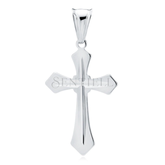 Zawieszka w formie krzyżyka wykonana ze srebra pr. 925 z powłoką rodu. Model o wymiarach 40 mm na 20 mm ma smukły, prosty korpus z równoległymi ramionami zakończonymi geometrycznymi, lekko fazowanymi końcówkami. Centralną część ramion zdobi diamentowanie w postaci symetrycznych nacięć biegnących wzdłuż osi pionowej i poziomej. Powierzchnia pozostaje polerowana, a zawieszka wyposażona jest w zamkniętą krawatkę o gładkim wykończeniu, dostosowaną do standardowych łańcuszków jubilerskich.