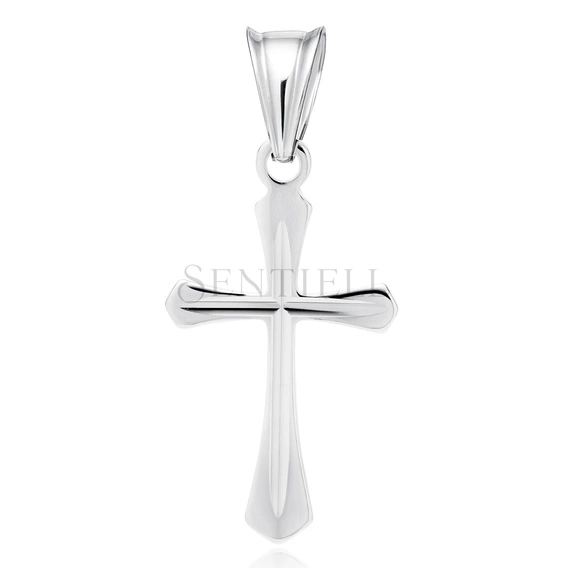 Zawieszka w formie krzyżyka wykonana ze srebra pr. 925 i pokryta warstwą rodu. Model o wymiarach 27 mm na 13 mm charakteryzuje się smukłą sylwetką oraz delikatnie poszerzanymi końcówkami ramion, uformowanymi w lekko zaokrąglone, geometryczne kształty. Na powierzchni pionowego i poziomego ramienia znajduje się subtelne, diamentowane nacięcie podkreślające symetrię i nadające całości elegancki, świetlisty akcent. Powierzchnia krzyżyka jest gładka, polerowana na wysoki połysk, a krawatka — zamknięta, profilowana — umożliwia wygodne zawieszenie na większości łańcuszków jubilerskich.