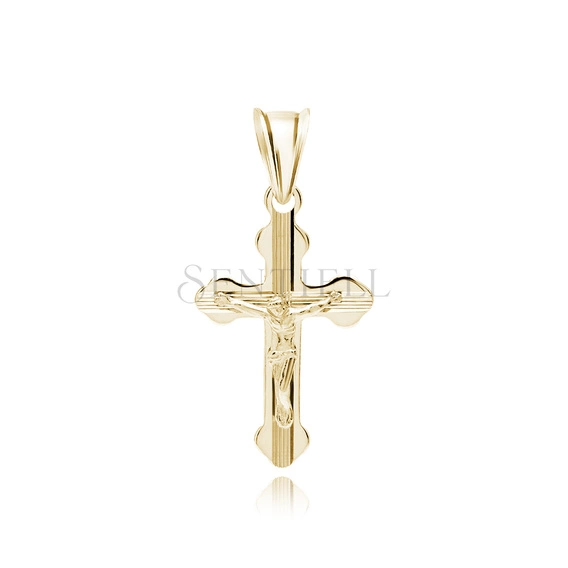 Zawieszka w formie krzyżyka wykonana ze srebra pr. 925 i pokryta powłoką 24K żółtego złota (e-coating). Model o wymiarach 26 mm na 12 mm posiada pełny, płaski korpus z delikatnie poszerzonymi, zaokrąglonymi zakończeniami ramion. Na powierzchni ramion zastosowano diamentowanie w formie równoległych nacięć biegnących wzdłuż osi poziomej i pionowej. W centralnej części umieszczono wypukły wizerunek Chrystusa. Powierzchnia krzyżyka jest polerowana, a krawatka zamknięta i wyprofilowana do standardowych łańcuszków jubilerskich.