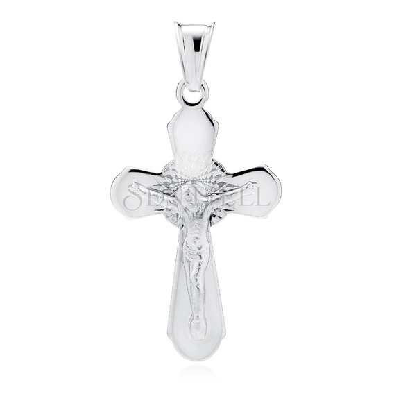 Zawieszka w formie krzyżyka wykonana ze srebra pr. 925 i pokryta warstwą rodu. Model o wymiarach 32 mm na 16 mm ma pełny korpus o zaokrąglonych zakończeniach ramion. Na centralnej części krzyża znajduje się trójwymiarowy relief postaci, a tło wokół górnego ramienia zdobi strefa diamentowania o promienistym układzie. Korpus posiada gładkie, polerowane powierzchnie kontrastujące z fakturowanym fragmentem dekoracyjnym. Zawieszka wyposażona jest w zamkniętą, polerowaną krawatkę dopasowaną do standardowych łańcuszków jubilerskich.
