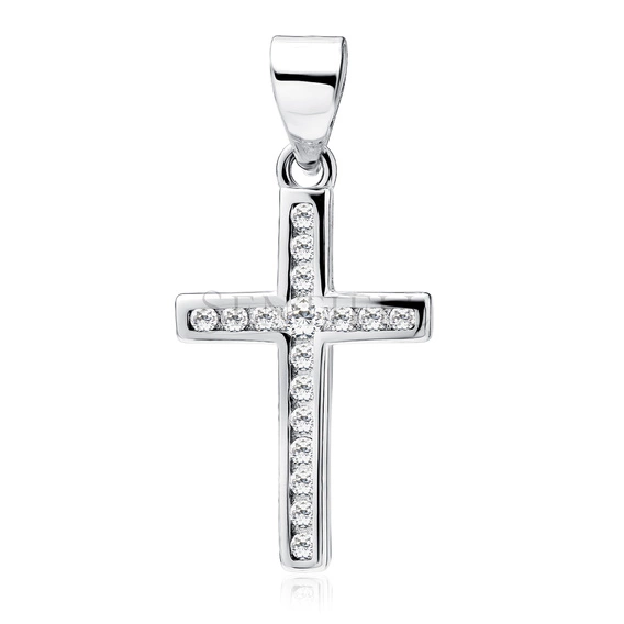 Zawieszka w formie krzyżyka wykonana ze srebra pr. 925 z powierzchnią pokrytą warstwą rodu. Model o wymiarach 25 x 12 mm ma pełny korpus o prostokątnym profilu ramion, w których osadzono równomierny rząd białych cyrkonii. W centrum znajduje się pojedyncza większa cyrkonia, zlicowana z linią pozostałych kamieni. Krawędzie są gładkie i polerowane, a symetryczny układ ramion podkreśla liniowy charakter opraw. Zawieszka posiada zamkniętą, gładko wykończoną krawatkę przeznaczoną do standardowych łańcuszków jubilerskich.