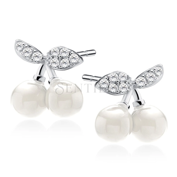 Srebrne kolczyki pr. 925 - wisienka z białymi cyrkoniami i perłą