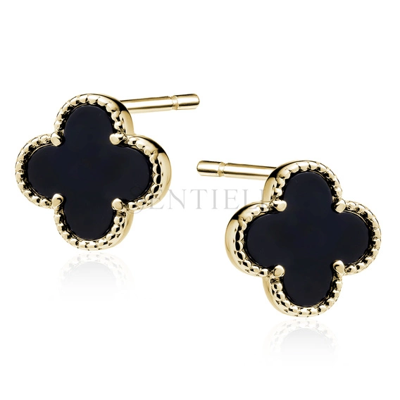Srebrne pozłacane kolczyki pr.925 z onyksem - czterolistna koniczynka