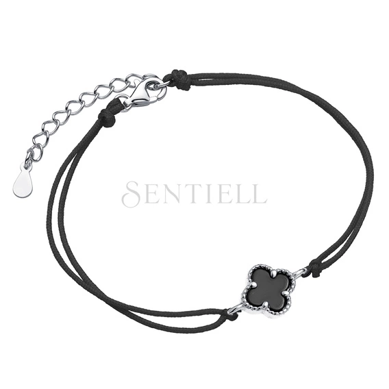 Srebrna bransoletka pr.925 z czarnym onyksem i czarnym sznurkiem - czterolistna koniczynka