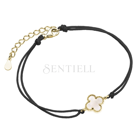 Srebrna pozłacana bransoletka pr.925 z masą perłową i czarnym sznurkiem - czterolistna koniczynka