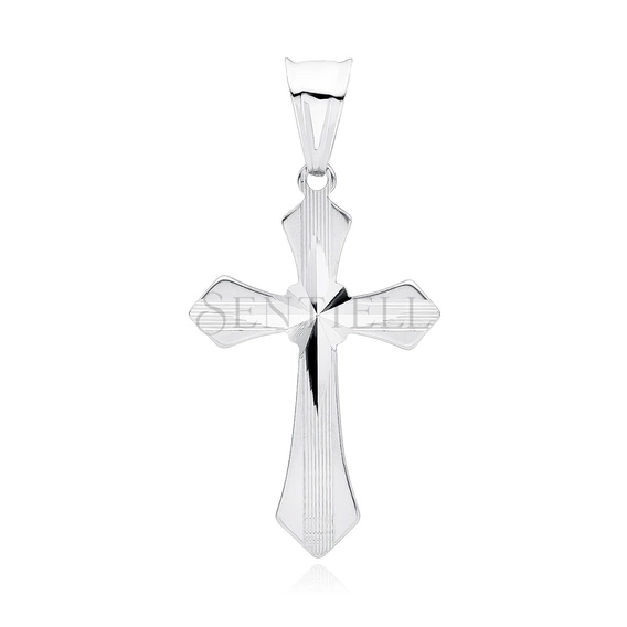Zawieszka w formie krzyżyka wykonana ze srebra pr. 925 o wymiarach ok. 41 x 21 mm. Ramiona są lekko rozszerzane ku końcom, z delikatnie zaokrąglonymi profilami. Lico zdobi diamentowany motyw promieniście rozchodzący się z centralnego punktu, uzupełniony pionowymi żłobieniami na dolnej części krzyżyka oraz poziomymi na ramionach poprzecznych. Powierzchnia wykończona jest w wysokim połysku i pokryta powłoką z rodu. Zawieszka wyposażona jest w standardową krawatkę przeznaczoną do typowych łańcuszków jubilerskich.