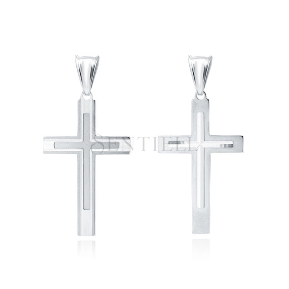 Dwustronna zawieszka w formie krzyżyka wykonana ze srebra pr. 925 o wymiarach ok. 43 x 22 mm. Obie strony mają odmienny układ diamentowanych żłobień: jedna z nich prezentuje pełne, krzyżowe linie o równoległym prowadzeniu, druga natomiast posiada węższy, pogłębiony profil z wyraźnie zaznaczonymi osiami pionową i poziomą. Ramiona są proste, o równoległych bokach, z subtelnie zaokrąglonymi krawędziami. Tło ma delikatnie matową powierzchnię, a całość pokryta jest powłoką z rodu. Zawieszka wyposażona jest w standardową krawatkę odpowiednią do typowych łańcuszków jubilerskich.
