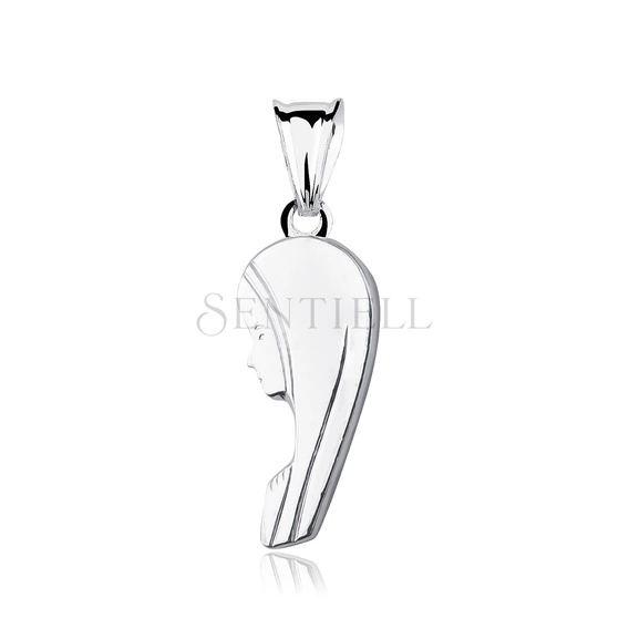 Medalik w formie zawieszki wykonany ze srebra próby 925, z powierzchnią wykończoną rodowaniem. Forma smukła, profilowana, o wydłużonych proporcjach około 25 mm długości i 8 mm szerokości, przedstawiająca boczny wizerunek Matki Boskiej Fatimskiej. Sylwetka opracowana w gładkim, lekko wypukłym reliefie, z płynnym przejściem linii twarzy i szat, bez dodatkowych zdobień powierzchniowych. Krawędzie łagodnie zaokrąglone, całość utrzymana w jednolitym, połyskowym wykończeniu, podkreślającym prostą, rzeźbiarską formę medalika.